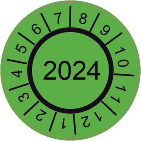 Vinyl keurstickers rond 30 mm, 100 stuks op vel met jaartal en 12 maanden met jaartal 2024
