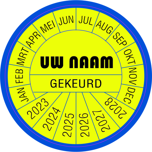 Keursticker 40 mm, geel-blauw met keuze tekst