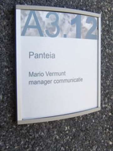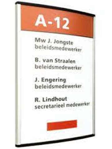 De licht naar binnen vallende sponning van dit systeem geeft de borden een rank en strak uiterlijk; de kopse zijden worden afgewerkt met grijze of zwarte kunststof kappen, die er tevens voor zorgen dat het wisselen van de inserts niet te gemakkelijk gaat. U kunt kiezen uit vele maten, inclusief de DIN maten A8 tot A3. Normaliter worden de borden gemonteerd met de kappen boven en onder, maar links en rechts kan ook. Indien gewenst kunnen de wandborden van bepaalde ruimten met een schuifpaneeltje worden uitgebreid t.b.v. bijvoorbeeld niet storen a.u.b.; u dient dan wel te monteren met de kappen links en rechts, omdat er een apart bordje met eigen kappen onder het hoofdbord komt.Ook de in een gebouw verplichte aanduidingen (vluchtplan, brandhaspel, nooduitgang, e.d.) integreren prachtig in de bewegwijzering als u ze verpakt in hetzelfde systeem.. sponningen van de profielen altijd boven en onder; afdekkappen altijd links en rechts